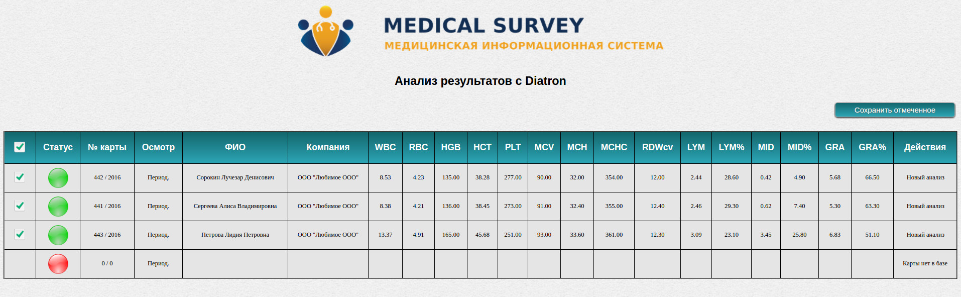 Наша система уже работает с диагностическими приборами анализов крови фирмы Diatron. Обмен данными осуществляется через файл, снимаемый с помощью родного ПО Diatron, и подгружается в базу.