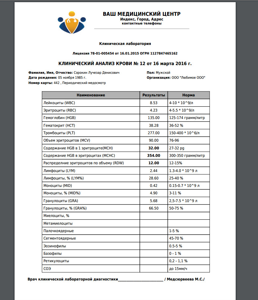 На выходе мы получаем анализ крови в PDF формате, который, к примеру, можно не только распечатать и выдать пациенту, но и отправить ему на электронную почту. Ведется также история анализов,