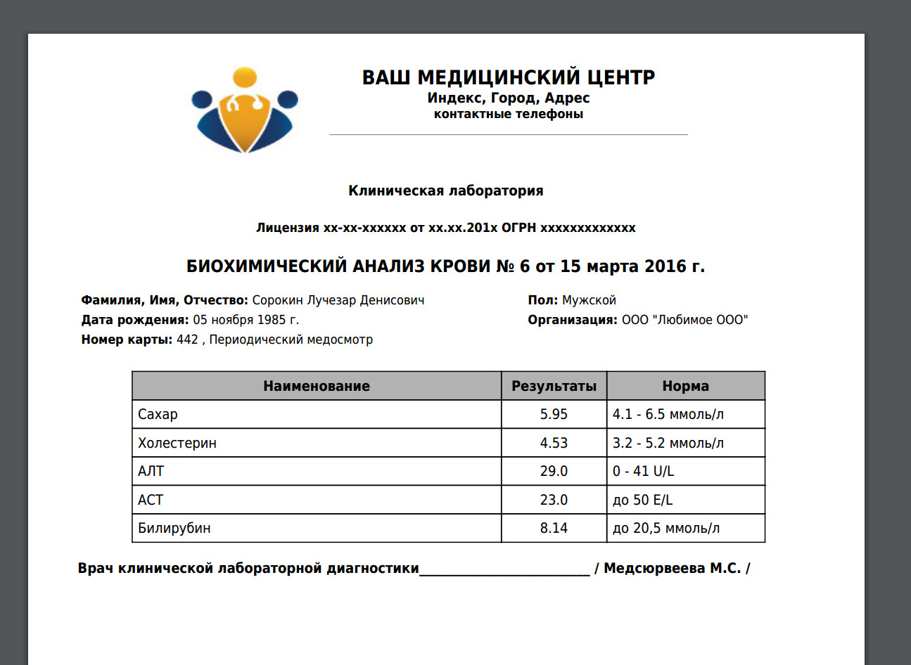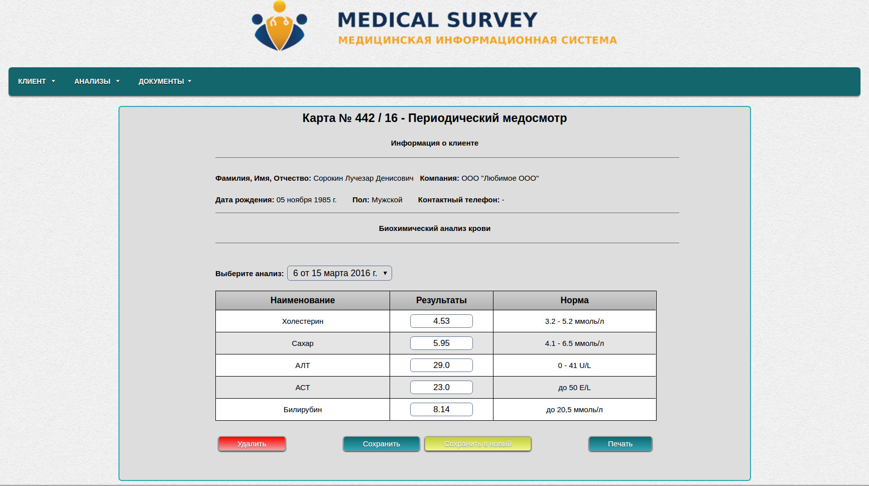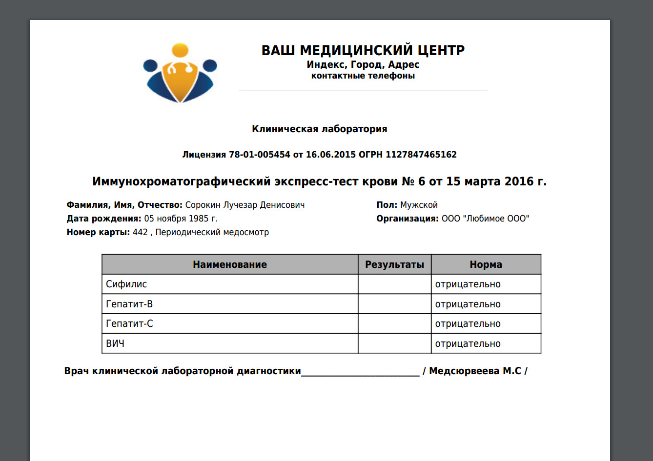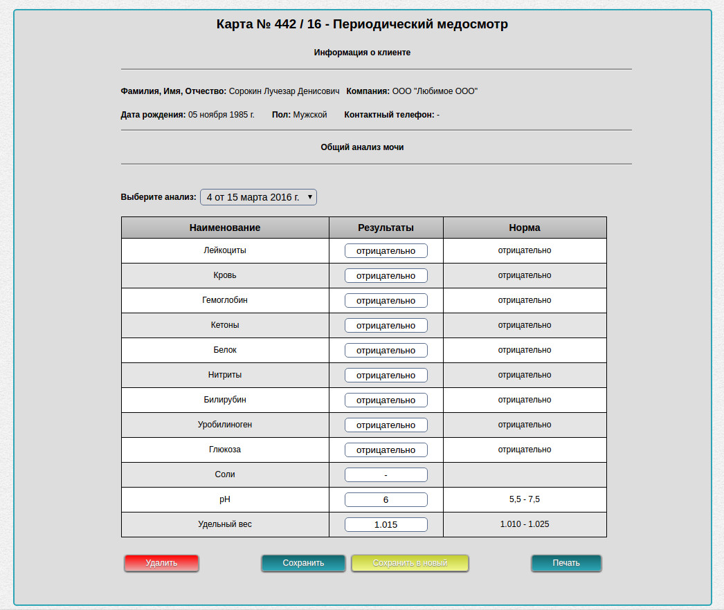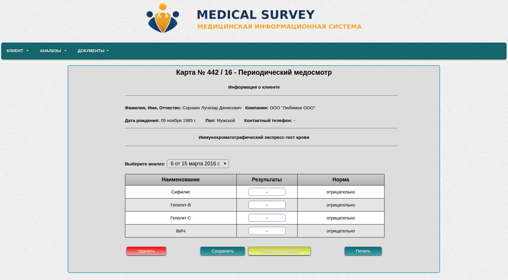 В нашей системе также имеются формы для ввода данных по клиническому и биохимическому анализу крови, общему анализу мочи, экспресс-тестов, тестов на наркотики, результаты которых вносятся оператором вручную. Но если у вас есть прибор, который позволяет выдать результат в электронном виде, наша компания приложить все усилия, для организации рабочего места в лаборатории, для автоматического занесения данных.